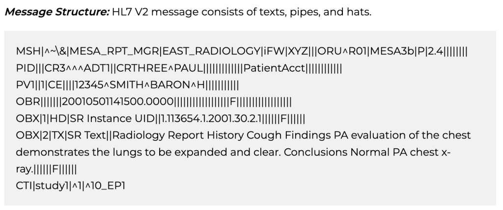 HL7 Version 2 (v2), first released in 1989, became the workhorse of healthcare data exchange. It’s a plaintext, pipe-delimited messaging standard that was revolutionary 40 years ago, allowing disparate systems to share basic information (admissions, lab results, billing events, etc.) in a common format.
