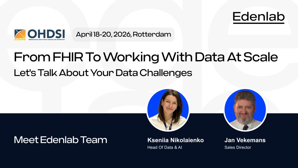 At this year’s event, Kseniia Nikolaienko, Head of Data and AI, and Jan Vekemans, Sales Director, will represent Edenlab and share our perspective on how healthcare organizations can move from fragmented source systems to data that is ready for analytics, research, and living evidence generation at scale.