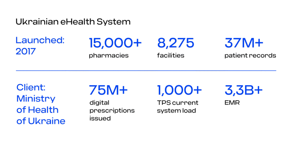 With over 37 million patients, more than 400,000 healthcare professionals, and 17,000+ medical institutions registered, eHealth is one of the most complex and high-load public IT infrastructures in the country. It processes and securely stores over 4 billion electronic medical records, enabling digital prescriptions, referrals and other essential healthcare services.